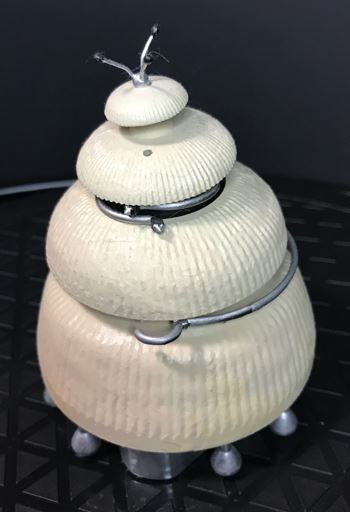 I've never been able to find a color photo of the original props themselves, however the colorized photo is probably pretty close. The dome parts appear to be of a semi-transparent tan or grey fiberglass material, and in one scene during the surviving Airlock episode, at least one of the three main Chumbley props had some blinking internal lights that are just barely visible from inside the bottom skirt section. The base, feet, and middle claw appear to be a standard brushed steel color.
