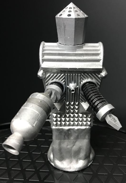For painting your figure, there's this pretty cool stuff called Spaz Stix Ultimate Mirror Chrome Airbrush Paint that will give you a highly reflective metalic sheen, especially if you paint it on a gloss black surface. If you used this stuff on a black SLA resin print, your entire figure would look like polished steel. On PLA printing, the layer lines disrupt the mirror chrome effect, but the end result will look very similar to the extremely light aluminum spraypaint they probably used on the original costumes.