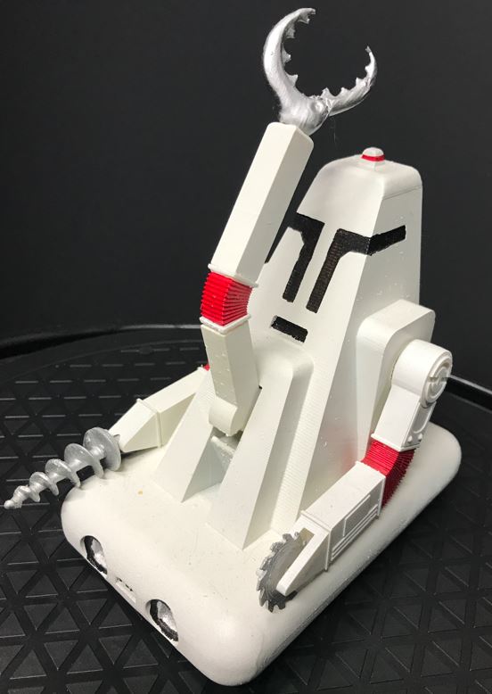 Painting your cleaner robot should be fairly simple. It's all a very bright white, except for the accordion joints in the middle of the arms, which are a bright red, and the drill/claw/saw attachments, which are metallic silver. The tiny light up at the top has a red band, but the actual flashing light inside is white.