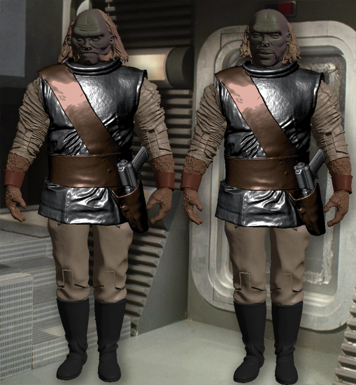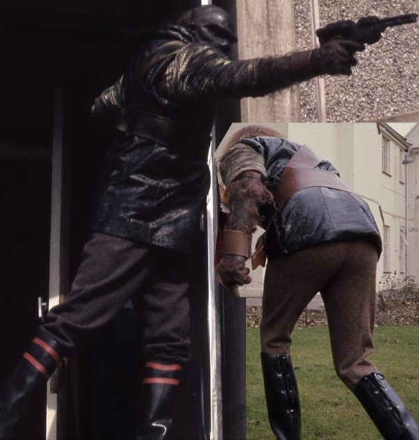The boots and pants also also differed slightly. Some of the Day of the Daleks Ogrons wore riding boots that laced up the back, while some of the Frontier Ogrons wore wellies with red stripes, and a darker brown shade of pants, and their sash/belts were shorter and a lighter more yellow color of leather.
