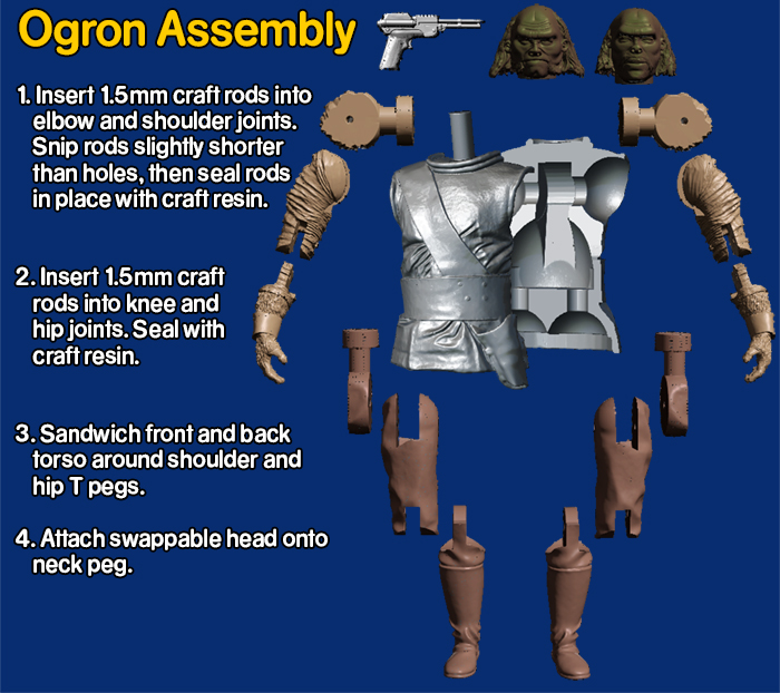 This figure requires at least one 1.5mm wide brass rod to be trimmed to length for the shoulder, elbow, knee, and hip pivots. These craft rods can be found online or in most craft stores that have a model airplane section. Alternatively you can use a thin wire coat hanger, sturdy piece of craft wire, or even a toothpick but you may need to widen some holes prior to final curing with a small hand drill.